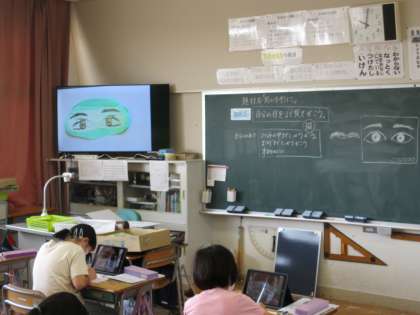 5年生の図工です。自画像を描いているのでしょうか。タブレットで自分の顔を写真にとり、その画面を見て絵にしています。自分が二人いるようでおもしろいです。