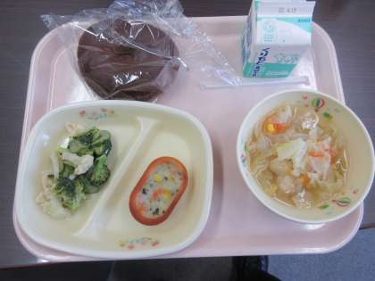 「小さめココアパン・牛乳・ポテトカップグラタン・春キャベツのスープ・花野菜サラダ」の野菜多めメニューです。年度初めのパン給食も今日で終わり、明日からご飯給食が始まります。