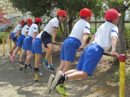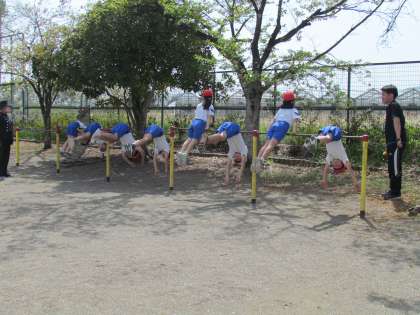 気温が上がり、太陽が照りつける中、3,4年生が元気に体育に取り組みました。まずは授業の約束を聞き、それから鉄棒に飛びつき、技を見せ合っていました。