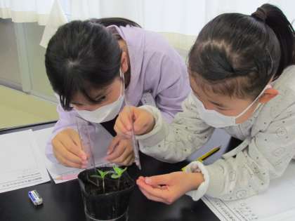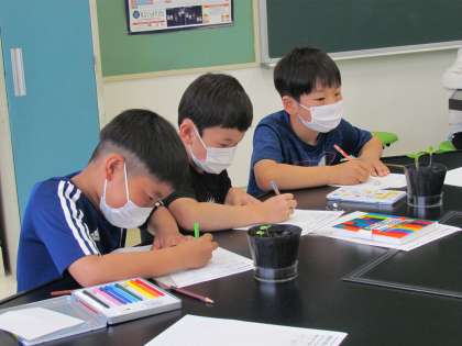 3年生の今日の理科は発芽の観察です。かわいい芽を出したひまわりやホウセンカなどの芽を一生懸命ワークシートに書き写しました。この後の成長も楽しみですね。