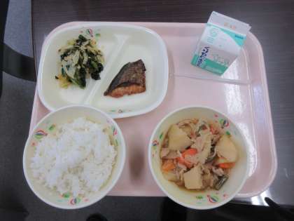 「ごはん・牛乳・アジのスタミナ焼き・肉じゃが・のり酢和え」の和食スタンダードメニューです。のり酢和えは、副菜の中では給食の人気メニューの一つです。肉じゃがにはたくさんのジャガイモが入っていました。隠れたビタミンCの宝庫なんだそうです。