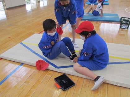 今日の体育は体力テストのための練習でした。タブレットで撮影してもらい、自分の姿を確認したり、どうやったら記録が伸びるのか考えてノートに書いたりしていました。本番までに少しでも自分の記録が伸びるように頑張りましょうね。