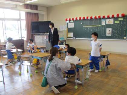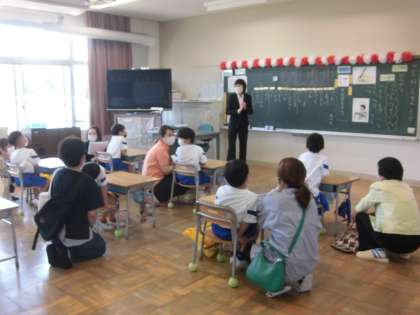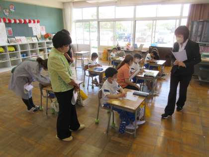 初めての授業参観、お母さんと一緒に平仮名の学習です。