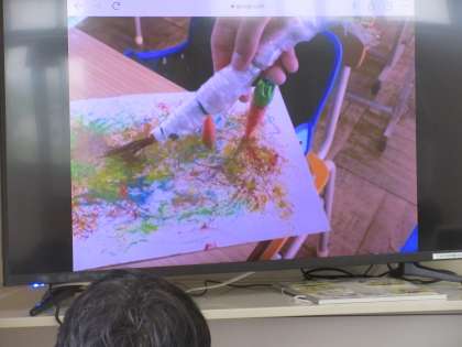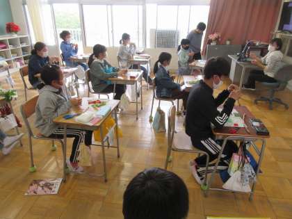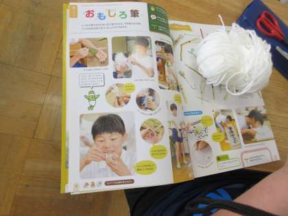 6年生の図工です。「おもしろ筆」という教材で、いろいろな材料で筆を作ります。発想の工夫が必要です。