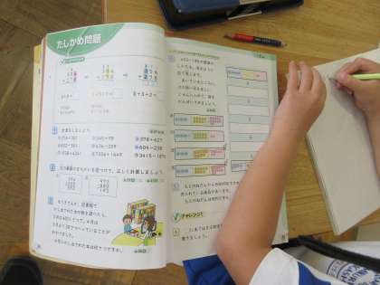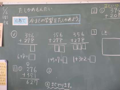 2年生の算数「大きな数のたし算ひき算」の学習です。まとめの授業なので「今まで学習したことを確かめる」ことがめあてでした。