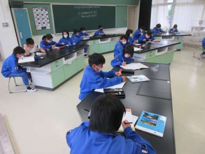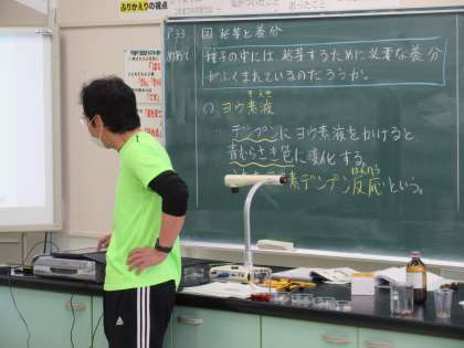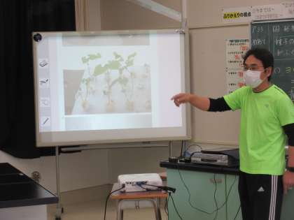 5年生の理科「発芽と養分」の学習です。発芽前と発芽後の種子にでんぷんが含まれているかをヨウ素液で調べ、発芽ででんぷんが使われたことを調べました。 美九里西小との兼務教員であるため、美九里西小で行った実験の結果も併せて提示して、考察を行いました。