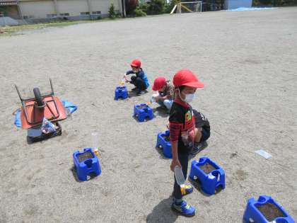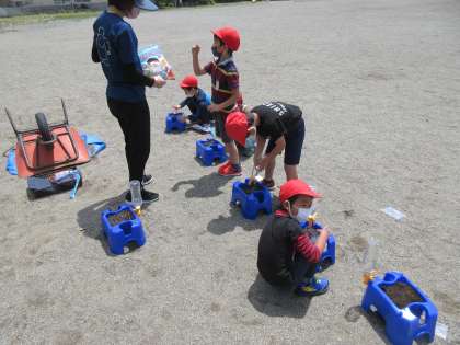 1年生が校庭で生活科「たねまき」の学習を行っていました。アサガオの種を専用のポット(植木鉢)に植えて、水をたくあんあげていました。早く芽が出てくるとよいですね。