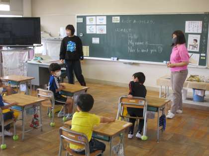 1年生のビビアン先生との外国語活動です。英語であいさつをする活動を友達同士で行いました。英語で数字も数えました。そして、よくできた時の「GOOD JOB!」のポーズもばっちり覚えました。