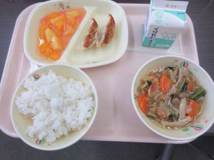 「ごはん・牛乳・ぎょうざ・中華あんかけ・アセロラジュレミックス」の中華メニューです。あんをご飯にかけ中華丼にしておいしくいただきました。
