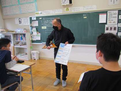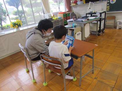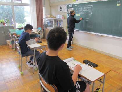 1組はタブレットで学習。2組は算数で分数のかけ算・割り算の学習でした。先生が質問するとしっかり答えることができ、学習に一生懸命取り組んでいました。