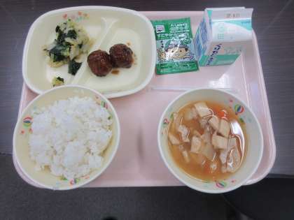 「ごはん・ふりかけ・牛乳・照り焼き肉団子・凍り豆腐の味噌汁・ほうれん草のオイル和え」の定食メニューです。各家庭の夕飯に出てきそうなメニューで、落ち着きます。