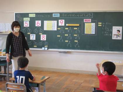 5月18日(水)授業風景〜3校時1年算数〜 公開日 2022/05/18 更新日 2022/05/18 2025できごと 1年生の算数です。「いくつといくつ」もだいぶできる数が増えてきました。今日は9を分けました。