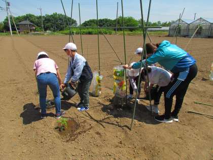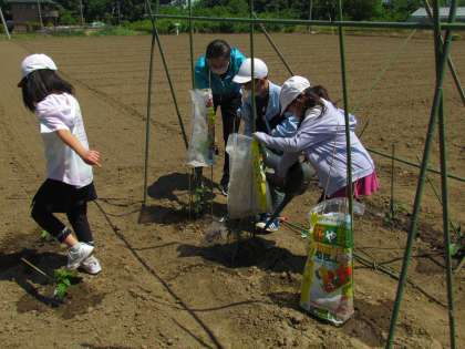 近くの農家の方に貸していただいている畑では2年生が野菜の水くれ真っ最中。重たいじょうろを協力して運び、たくさんお水をあげました。ご苦労さま。