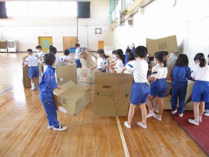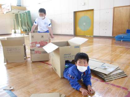 5月19日(木)授業風景〜1・2校時2年図工〜だんボールに入ってみると!?(その1) 公開日 2022/05/19 更新日 2022/05/19 2025できごと だんボールのはこに入ってみることから、おもいついたことをくふうしてつくりました。