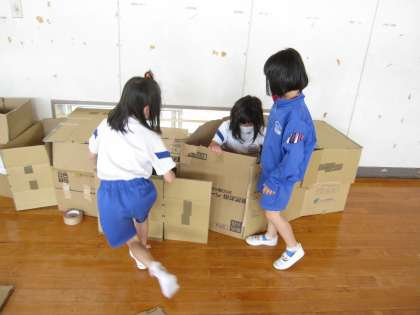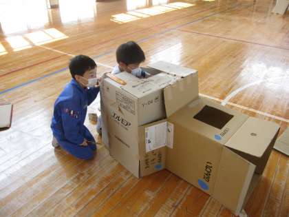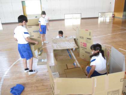 5月19日(木)授業風景〜1・2校時2年図工〜だんボールに入ってみると!?(その2) 公開日 2022/05/19 更新日 2022/05/19 2025できごと だんボールカッターをつかって、すきなかたちをつくりました。