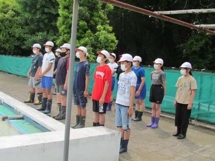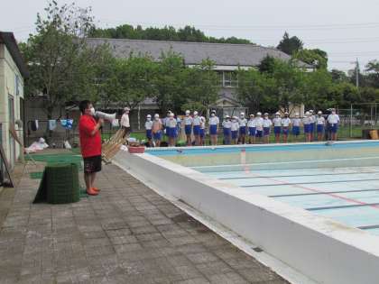 今年は美九里西小学校のプールを使わせてもらい、水泳の授業を行います。そのため、今日は東小の代表として6年生全員で美九里西小のプールを西小のお友達と一緒にきれいにします。