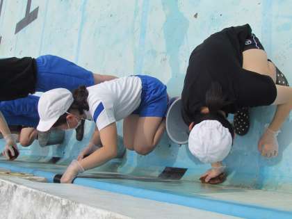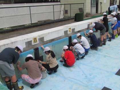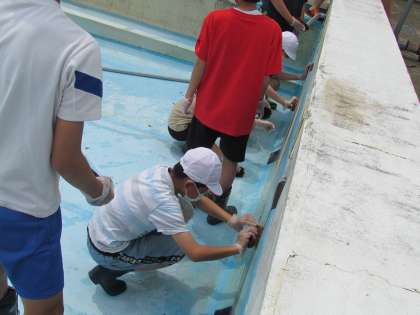 西小の人とお互いにあいさつをして、始まりました。プールの中に入って側面をたわしでこすります。だんだんきれいになってきました。
