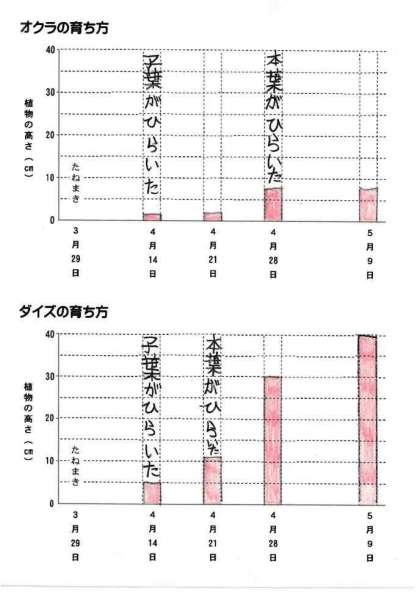 オクラとダイズの育ち方(植物の高さ)をグラフ化しました。育ち方の違いがよくわかりました。