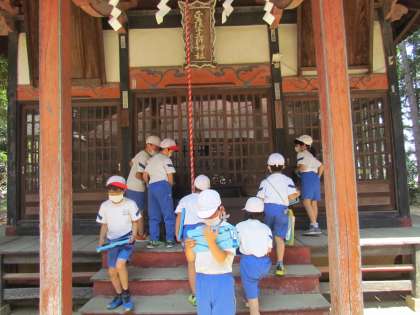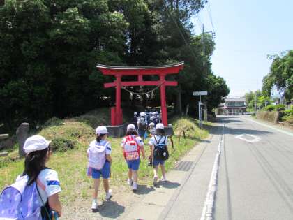 見学場所最後の土師神社に到着。大きな木に覆われている神社の中はとても涼しくて気持ちよかったですね。タブレットでたくさん写真を撮りました。
