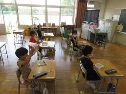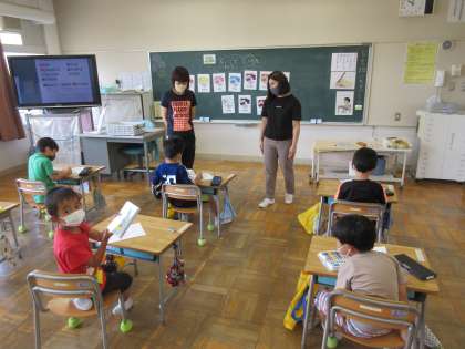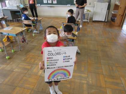 1年生の外国語活動です。水曜日はALTが来てくれます。今日は英語で色を言う学習でした。ワークシートにカラフルに色を塗って見せてくれました。