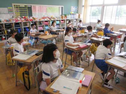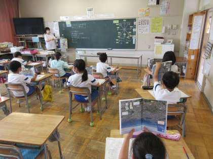 3年生の社会は、藤岡市の学習をします。今日は藤岡市全体の航空写真を見て、市の土地の高さや広がりについて調べていました。方角を合わせるために、資料をさかさまに見て確認しました。