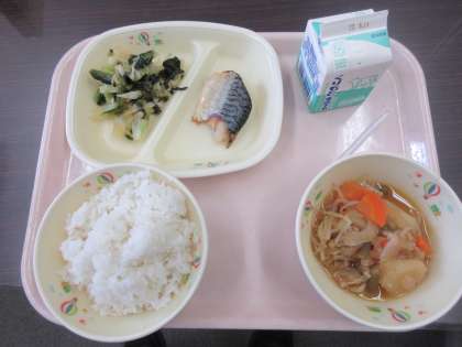 今日の給食は、「ごはん・牛乳・さばの塩焼き・しょうが煮・小松菜ののり酢和え」の和食メニューでした。のり酢和えも、普段はホウレンソウが使われますが、今日は小松菜でした。食感が違うので、新鮮な味わいがしました。さばはふわふわにうまく焼けていました。