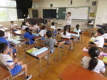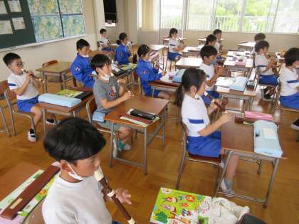 3年生の音楽「リコーダー」の授業です。息の拭き方、タンギングなどの基本的な音の出し方を学んでいました。