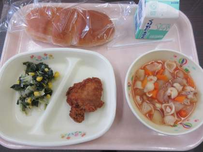 今日のメニューは「ロールパン・牛乳・クリスピーチキン・ミネストローネ・ほうれん草のサラダ」のイタリアンです。ミネストローネは野菜のうまみが出ているスープでした。