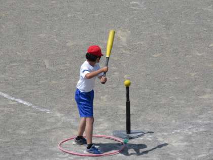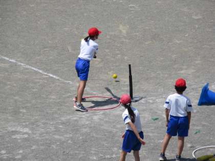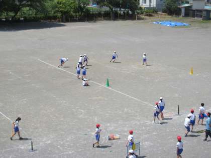 56年の体育です。校庭でベースボール型ゲームを行っていました。投げたボールではなくティされたソフトなボールを打ちます。守備もとって一塁へ送球するのではなく、ボールを保持したらみんなでサークルの中に集まります。接触のないルールに工夫されています。