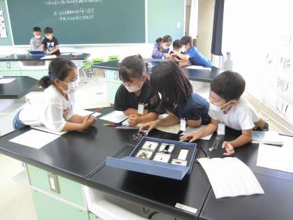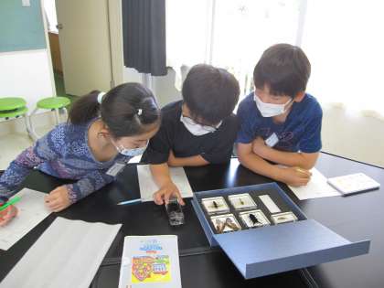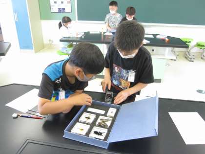 プラスチック封入昆虫標本を使って、カブトムシ、クワガタ、チョウ、トンボ、ハチ、バッタの体のつくりを調べました。