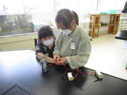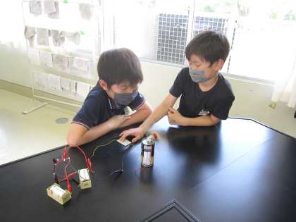 かん電池のつなぎ方と、モーターの回る速さの関係を調べました。