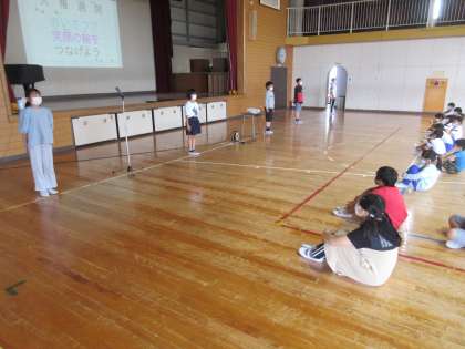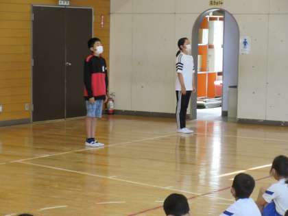 本日より6月17日まで、前期人権集中学習期間となります。テーマは「あいさつで笑顔の輪をつなげよう」です。早速、今朝の業前の時間に、体育館に全校児童が集まり、「人権オープニング集会」を行いました。児童会より、この期間に取り組む重点が発表されました。