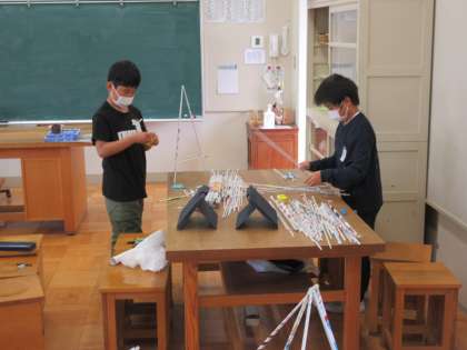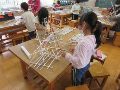 4年生の図工「つなぐんぐん」の授業です。チラシを丸めて作った紙の棒をたくさん使い、立体を作ります。形を保てるようにつなげていくのが至難の業でした。
