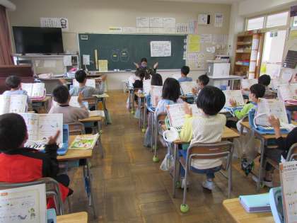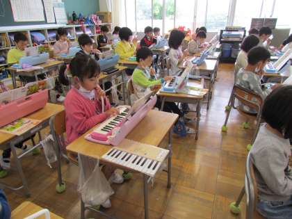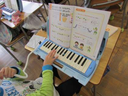 教室からいい音が聞こえてきました。2年生はピアニカを使って合奏です。指使いが難しいけれど、リズムをとって上手に吹くことができました。