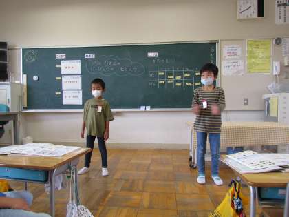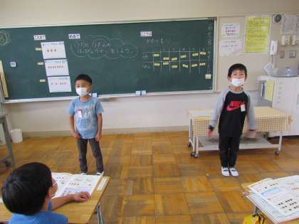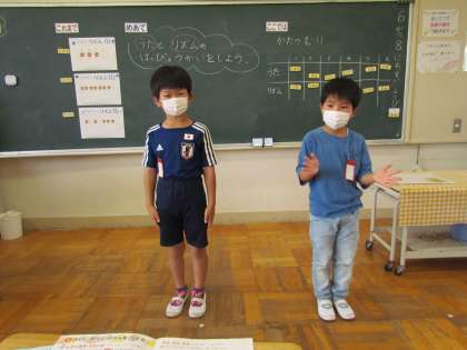 1年生は2人組になって、「かたつむり」を歌とリズムで発表していました。みんなの前ではずかしがらずに発表することができ、立派でしたね。