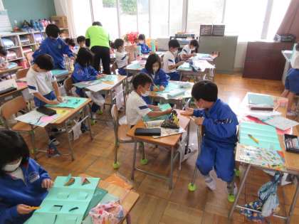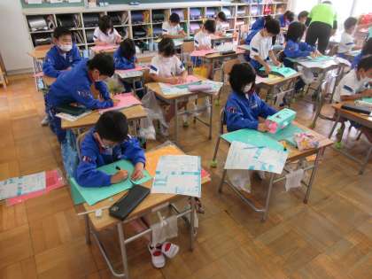 2年生の図工「まどからこんにちは」の製作風景です。各自が創意工夫しておもしろい建物を作っていました。