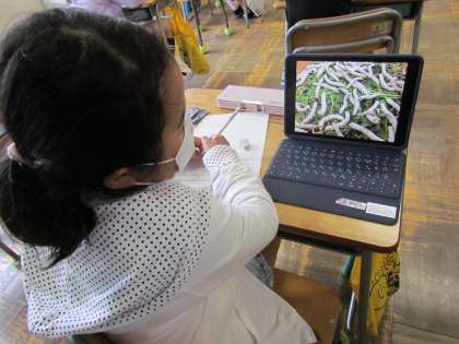 卵から育てている「かいこ」がとても大きくなりました。毎日、担任の先生と3年生のみんなで校庭にある桑の木から葉っぱをとってきて大切に育てています。あともう少しで「まゆ」になりそうでドキドキです。