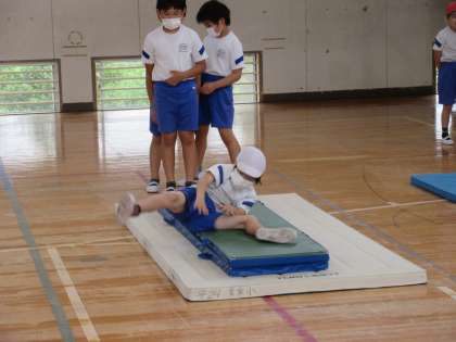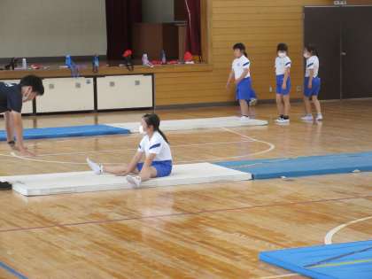 本日予定されていた中学年のプール指導は、気温低下のために中止となりました。そこで34年は3校時に体育館で体育「マット運動」を行っていました。マットでいくつかの場をつくって開脚前転の練習を行っていました。