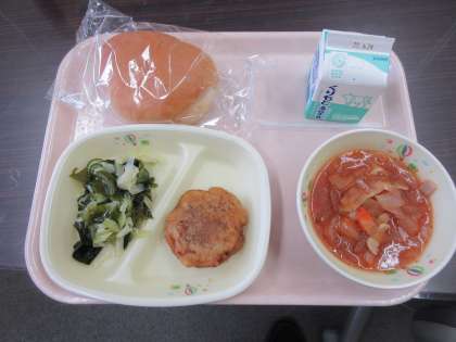 「パーカーハウス・牛乳・鶏肉のレモンソース・豆と野菜のトマトスープ・新玉ねぎとわかめのサラダ」のチキンバーガーメニューです。チキンのレモンソースがおいしかったです。スープとサラダには野菜がたくさん入っていました。