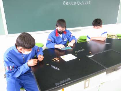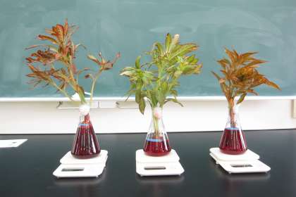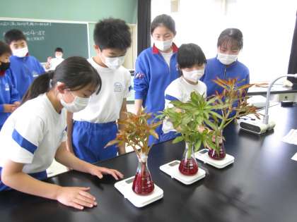 6月16日(木)授業風景〜6校時6年理科〜植物の成長と水の関わり(その2) 公開日 2022/06/16 更新日 2022/06/16 2025できごと 朝、ホウセンカの根を赤い水につけておいたら、体全体が赤く染まりました。三角フラスコの中の水面が下がっているのがわかります。このホウセンカの体のいろいろな部分をカッターナイフで切って、断面を観察しました。