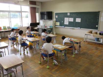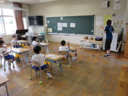 1年生の音楽です。音楽に合わせて、手拍子や体を動かしたりしていました。