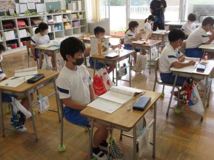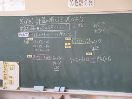 6月23日(木)授業風景〜4校時4年算数〜 公開日 2022/06/23 更新日 2022/06/23 2025できごと 4年生の算数です。計算のきまりのうち分配法則の学習です。それぞれのまとまりごとに計算して最後に足す方法と、最初に縦を足した後でかけ算をする方法では、結果は同じであることを考えました。