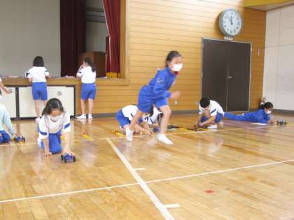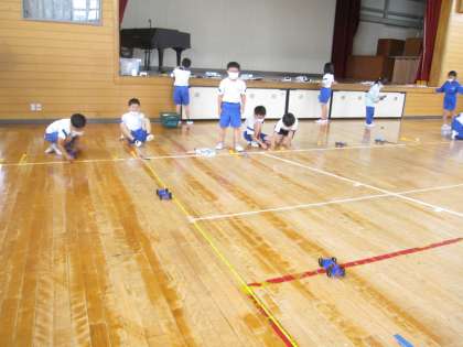わゴムののばし方をかえたときの車の進むきょりのかわり方をくらべながら調べました。