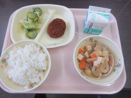 「ごはん・牛乳・甘辛メンチカツ・けんちん汁・浅漬け」のメンチカツ丼メニューです。甘辛煮は、ぐんまのソウルフードですね。