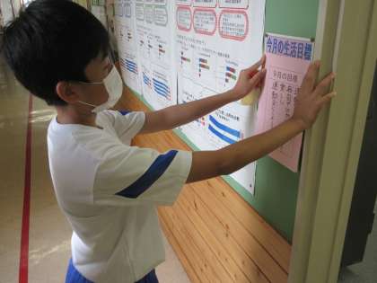 一昨日の委員会の時間の活動で仕上げた今月の生活目標の掲示物を、児童会の代表の児童が今日の昼休みに校長室ににもってきてくれて、はっていってくれました。運動会の成功に向けてみんなで取り組めていけたらよいと思います。