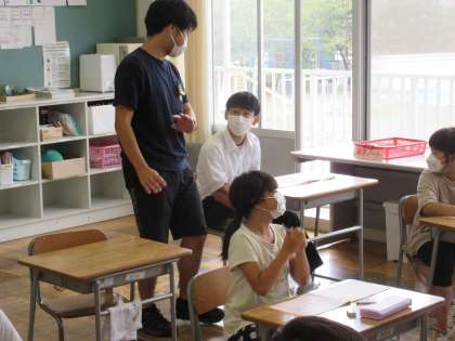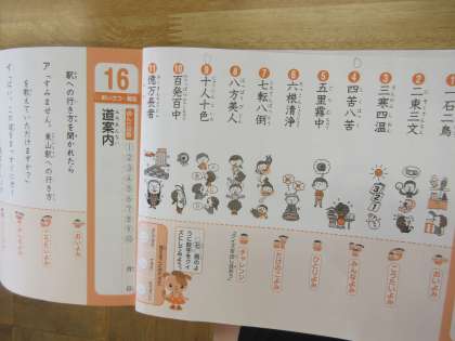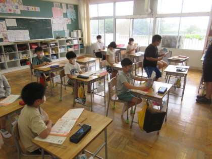 4年生の国語では、数字を使った四字熟語について学習していました。クラスを二つに分け暗唱の声の大きさを競ったり、順番に起立して暗唱したりと楽しみながら学習をしていました。中学生も判定員として活躍していました。