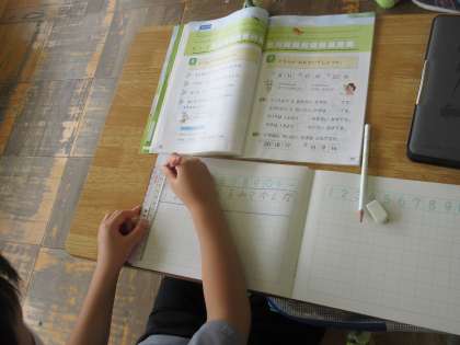 1年生の算数です。定規の長さの学習です。めあてをノートに書くのにも、一つ一つ何を使ってどこまで線を引くとかの確認をしながら書いています。