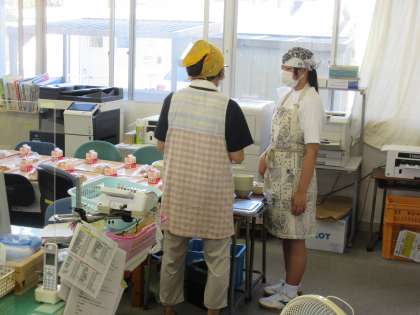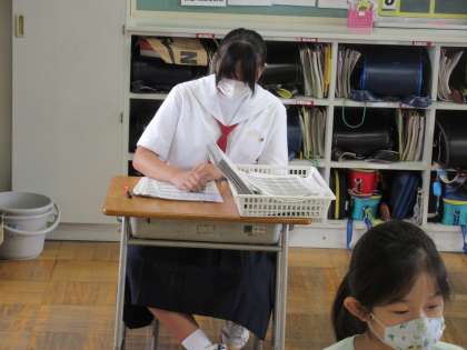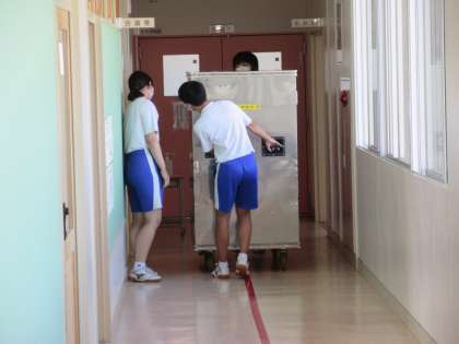 中学生のチャレンジウィークも二日目となりました。昨日教えた仕事も、確認しながらですが、てきぱきとできるようになってきています。児童の給食の運搬は自分たちでできるようになりつつあります。また今日からは、職員室の給食(自分たちの給食も含む)の配膳も交替でしてもらうことにしました。中学生になると体も大きくなり力もあるので助かります。配属された各教室では、宿題のノートチェックなどの仕事をしてもらっているところもありました。
