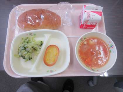 「ミルクパン・牛乳・コーンカップグラタン・ミネストローネ・ブロッコリーサラダ」のメニューです。ミネストローネに入っているジャガイモは、藤岡特別支援学校の農場で、特別支援学校の児童生徒が丹精込めて作ったジャガイモが使われているということです。ありがとうごじました。