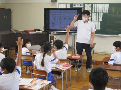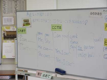 5年生は、外国語の授業です。今日は「友達にできること、できないことをきく文」について学習しました。これまでの学習が肯定文だったものを疑問文にした感じです。